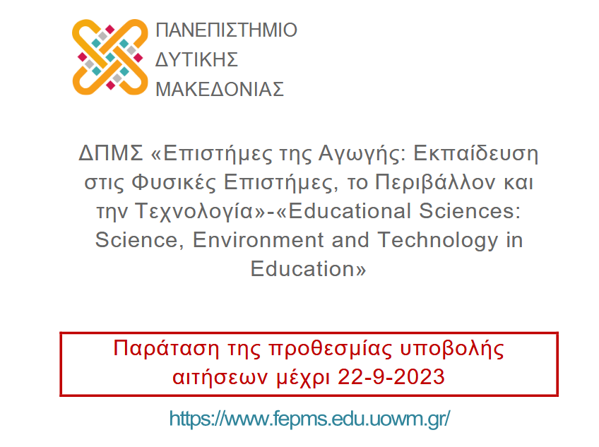 Η Επιτροπή Προγράμματος Σπουδών του ΔΠΜΣ:«Εκπαίδευση στις Φυσικές Επιστήμες, το Περιβάλλον και την Τεχνολογία- Educational Sciences: Science, Environment and Technology in Education» έχει την τιμή να ανακοινώσει τη λειτουργία του συγκεκριμένου προγράμματος, για το ακαδημαϊκό έτος 2023-2024……
