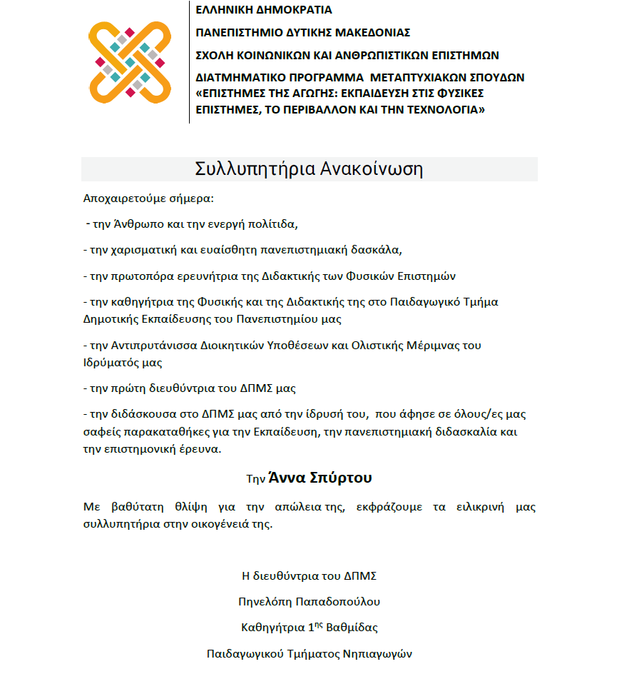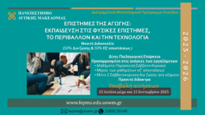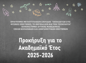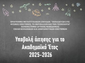 Το Παιδαγωγικό Τμήμα Νηπιαγωγών και το Παιδαγωγικό Τμήμα Δημοτικής Εκπαίδευσης Σχολής Κοινωνικών και Ανθρωπιστικών Επιστημών του Πανεπιστημίου Δυτικής Μακεδονίας επανίδρυσαν το Διατμηματικό Πρόγραμμα Μεταπτυχιακών Σπουδών (ΔΠΜΣ) με τίτλο: «Εκπαίδευση στις Φυσικές Επιστήμες, το Περιβάλλον και την Τεχνολογία − Science, Environment and Technology in Education» (ΦΕΚ 3050/τ.Β/27-7-2018) σύμφωνα με τις διατάξεις του ν. 4485/2017.